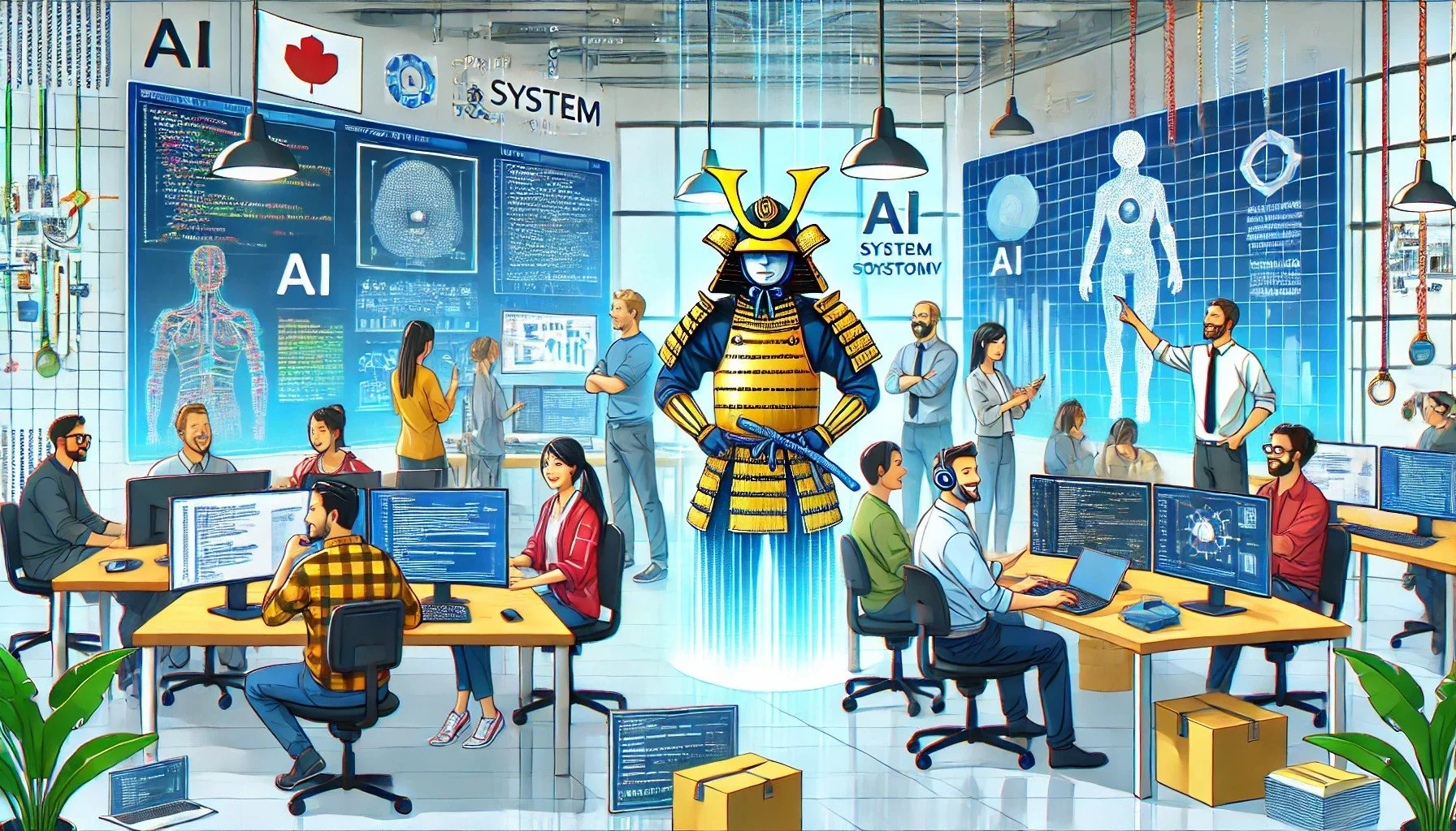 • 大きな会議室のような場所で、多数の人がパソコンを操作しながら、デジタル技術と人工知能について学習または会議を行っている。壁には「コンテンツ配信、再スキリングのための内容」や「デジタルトランスフォーメーション」などの専門用語やグラフ、ロックアイコンなどの表示がある。